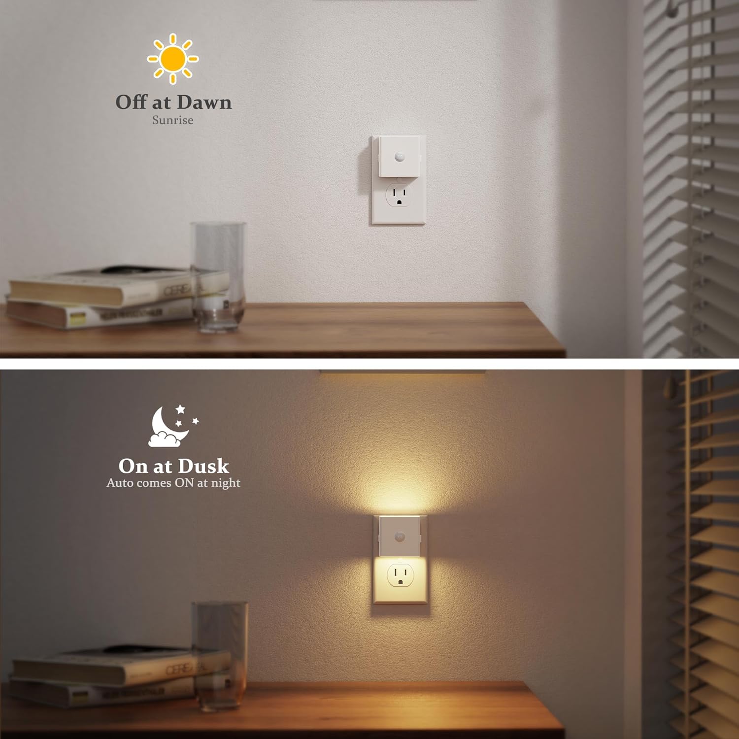 - 3 Lighting Modes: This plug in night light features a built-in motion sensor and 3 lighting modes. The "On" mode keeps the light always on; the "Off" mode turns the light off completely. The "Auto" mode activates the light automatically upon detecting motion in the dark (Sensing Range: 3-5M, 120°), and turns it off after 60 seconds of inactivity
