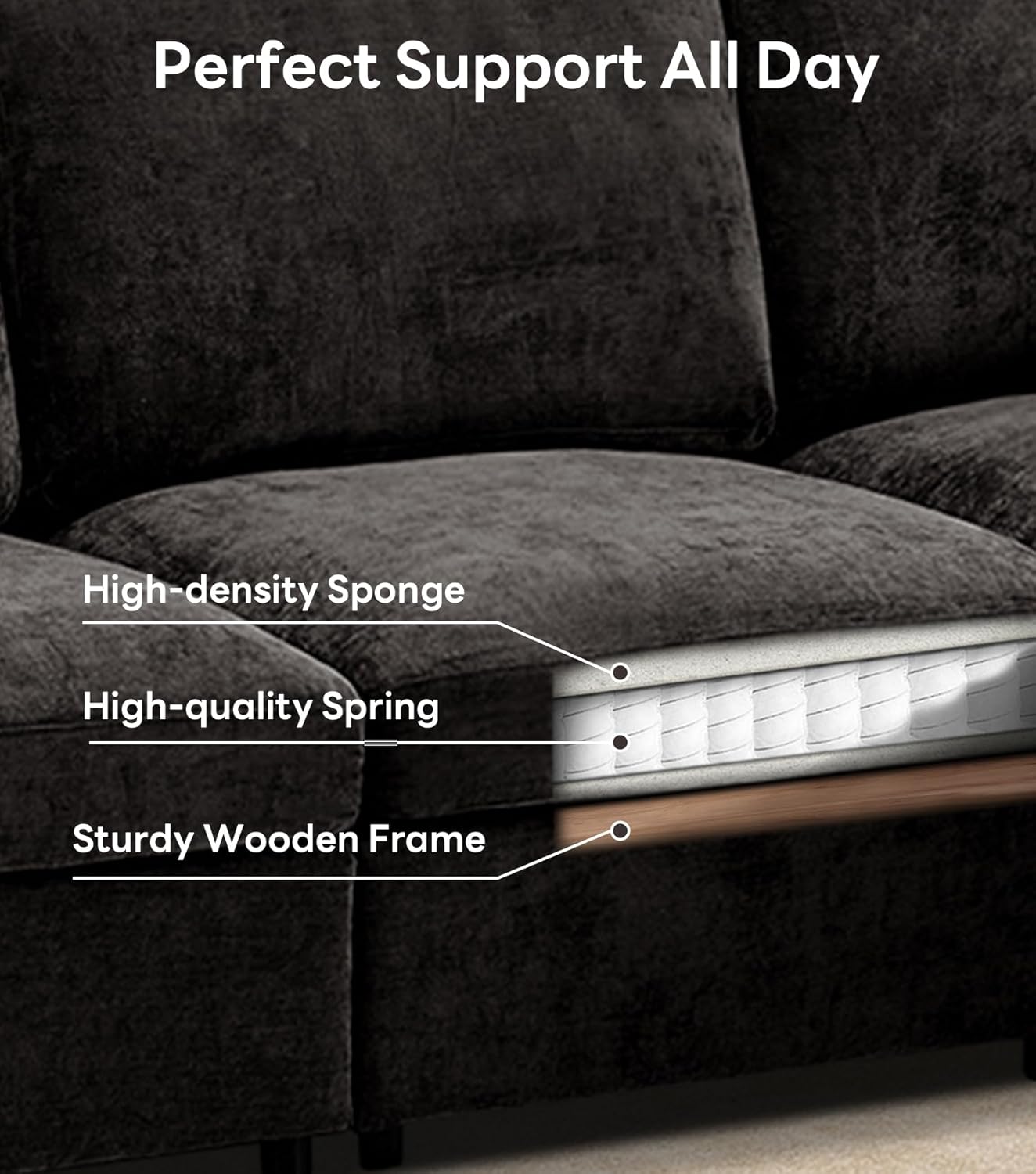 - Chenille Fabric - Wrapped in chenille fabric, this sectional couch combines velvety softness with everyday durability. The dense, textured weave resists pilling while maintaining its plush feel, and its naturally breathable properties keep you comfortable in any season.