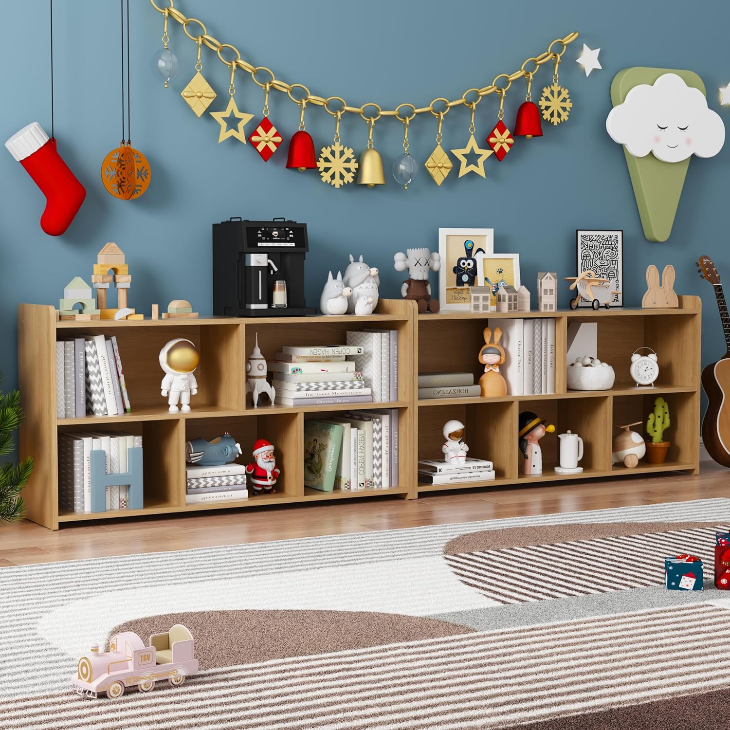 Book Shelf Set of 2, 5 Cubes Storage Organizer, Open Shelf Wooden Bookcase, Freestanding Log Bookshelf Cube Shelf for Bedroom, Living Room, Home Office