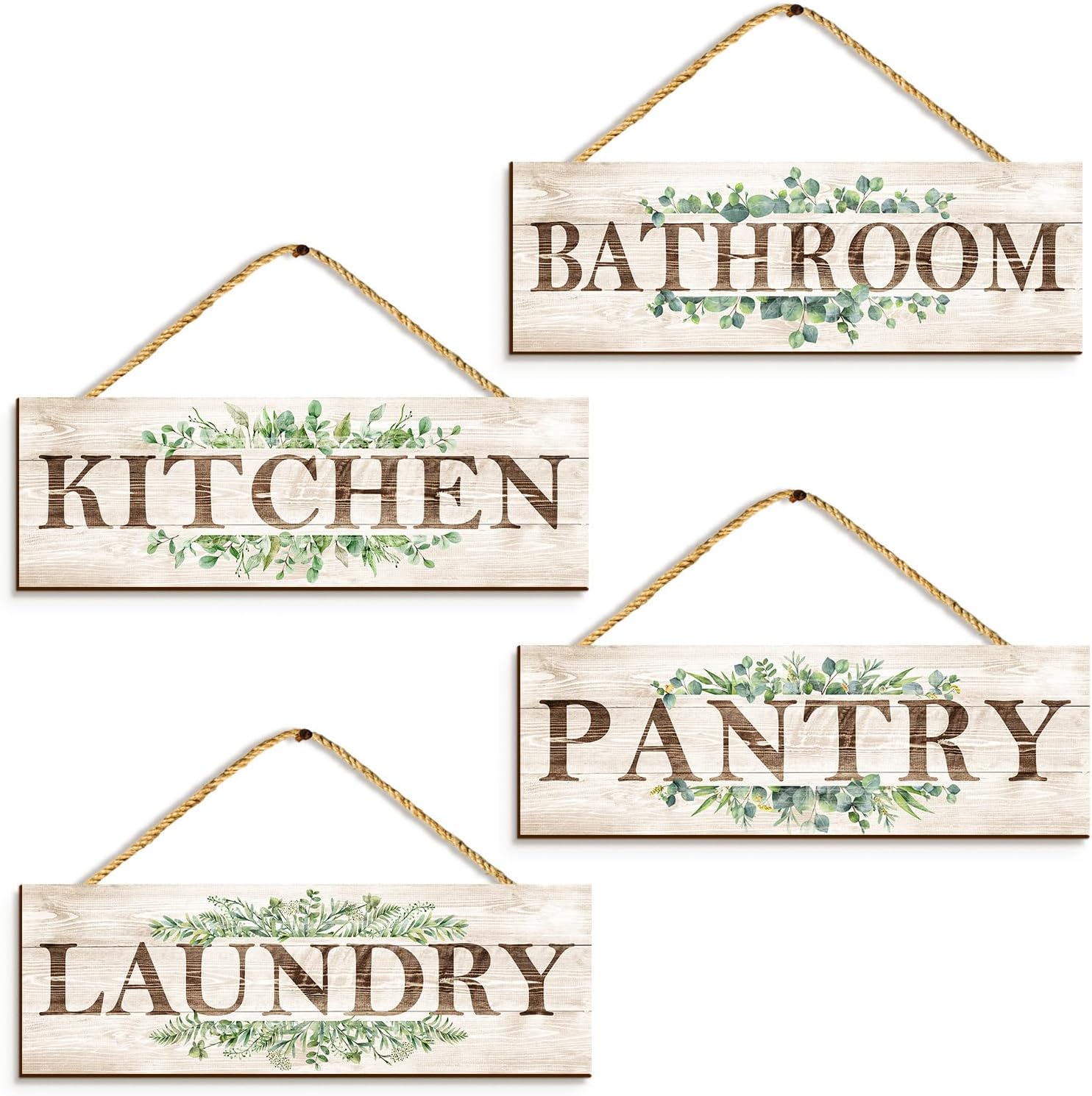 Bathroom Kitchen Laundry Pantry Sign Wall Decor 4 Piece, Wall Art with Plant Print, Rustic Farmhouse Wall Hanging Plaque Home Kitchen Decorative Bathroom, 4.7 x 13.7 inches