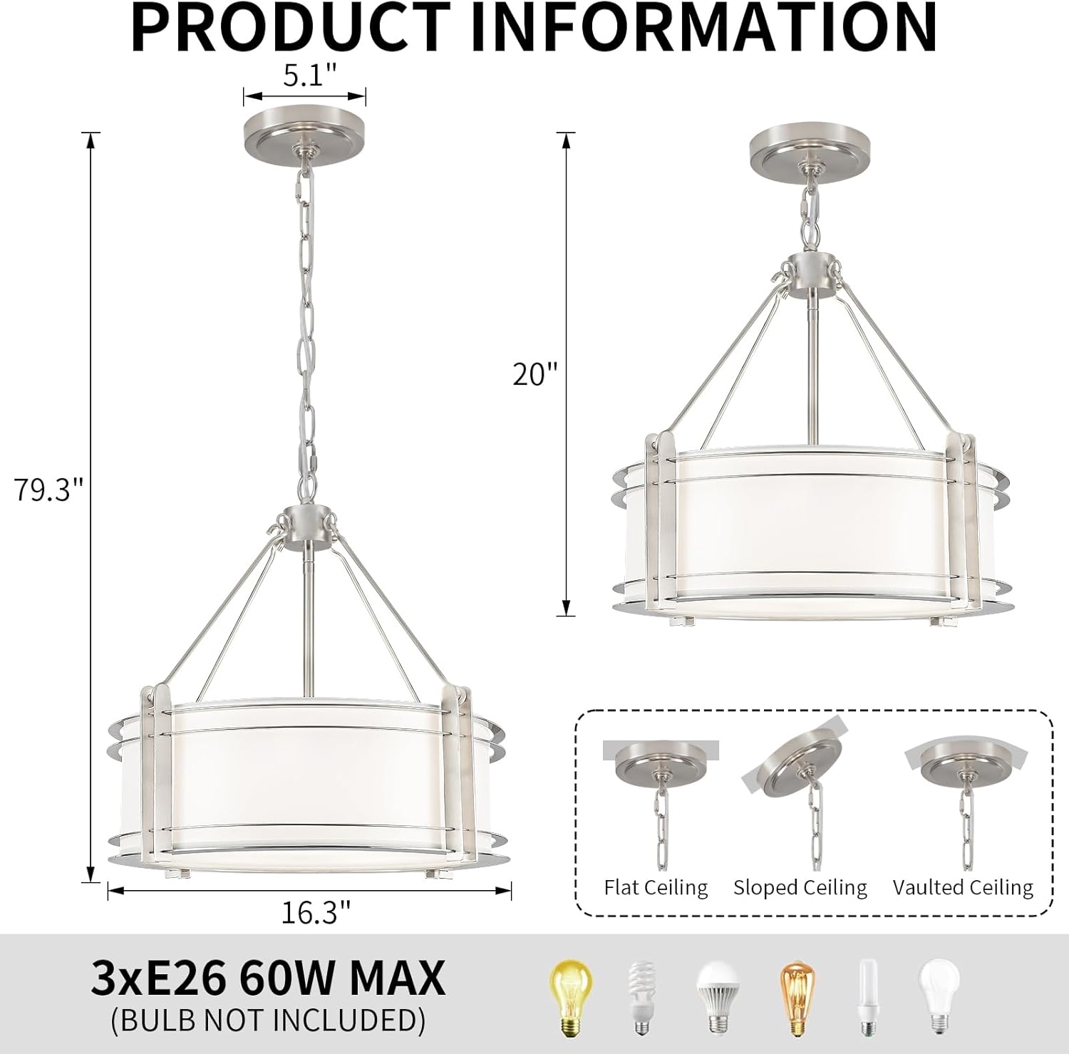 - 【Modern Drum Chandelier】Transform your space with the brushed nickel drum pendant lights,a sleek fusion of modern and classic styles.Featuring a brushed nickel metal frame and white fabric shade,it casts a gentle,eye-friendly glow.This drum chandelier is Ideal for kitchen island,dining rooms,living room or bedroom,adding a touch of warmth and elegance to any decor