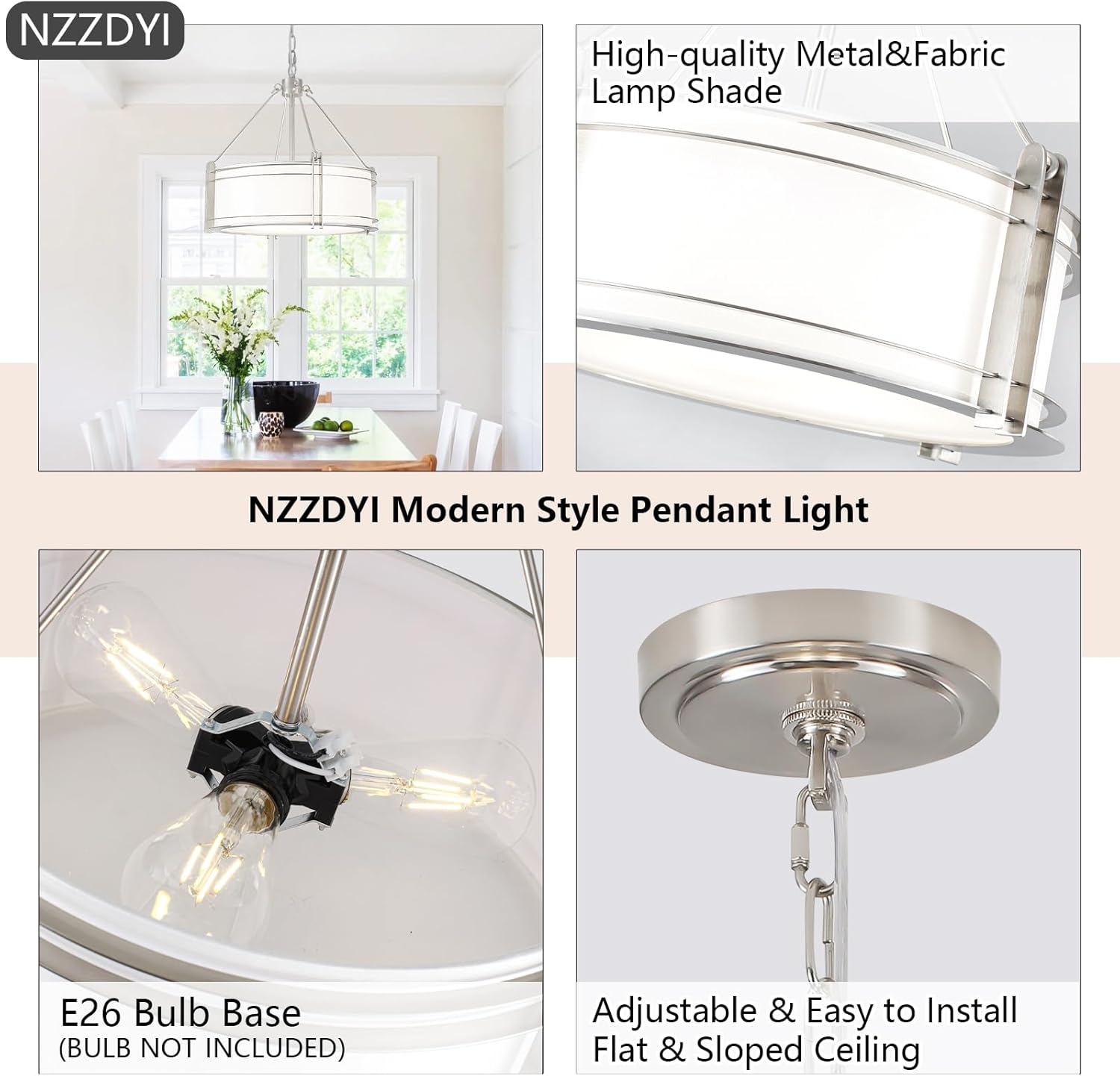 - 【15-Minute Easy Installation】The drum pendant light kitchen island features a simple design and comes with clear instructions and all necessary hardware. You just need to fix the lamp holder and the lampshade together,then install the light fixture on the home circuit and install the bulb,you can enjoy a perfect brushed nickel modern drum pendant light in less than 15 minutes