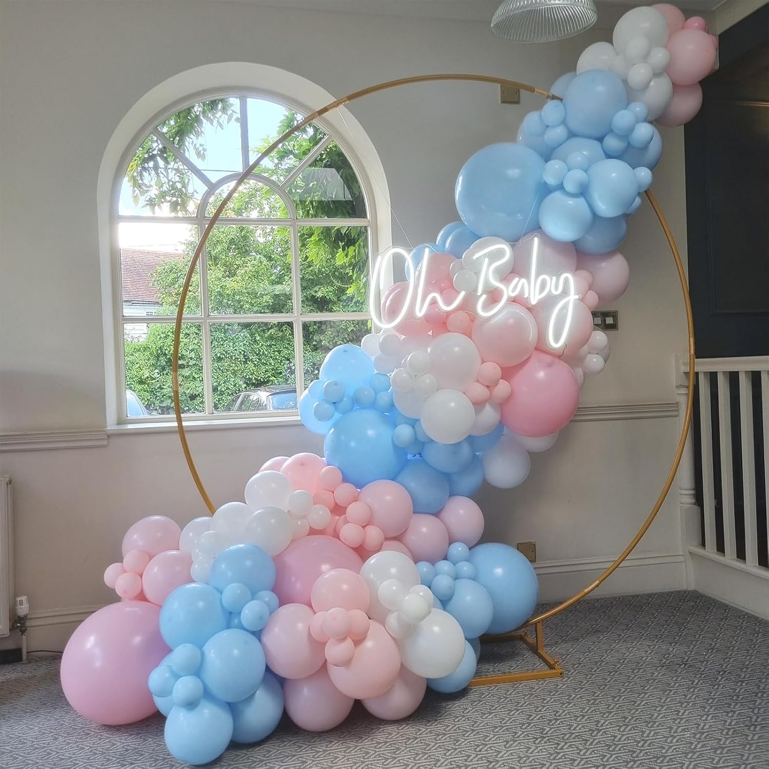 - Pink and Blue Balloons: Includes 12 inch 35 pcs helium balloons with 8 pcs pastel pink balloons, 9 pcs light blue latex balloon, 8 pcs matte white balloon, 5 pcs pink gold confetti balloon, 5 pcs blue gold confetti balloons and a roll white ribbon
