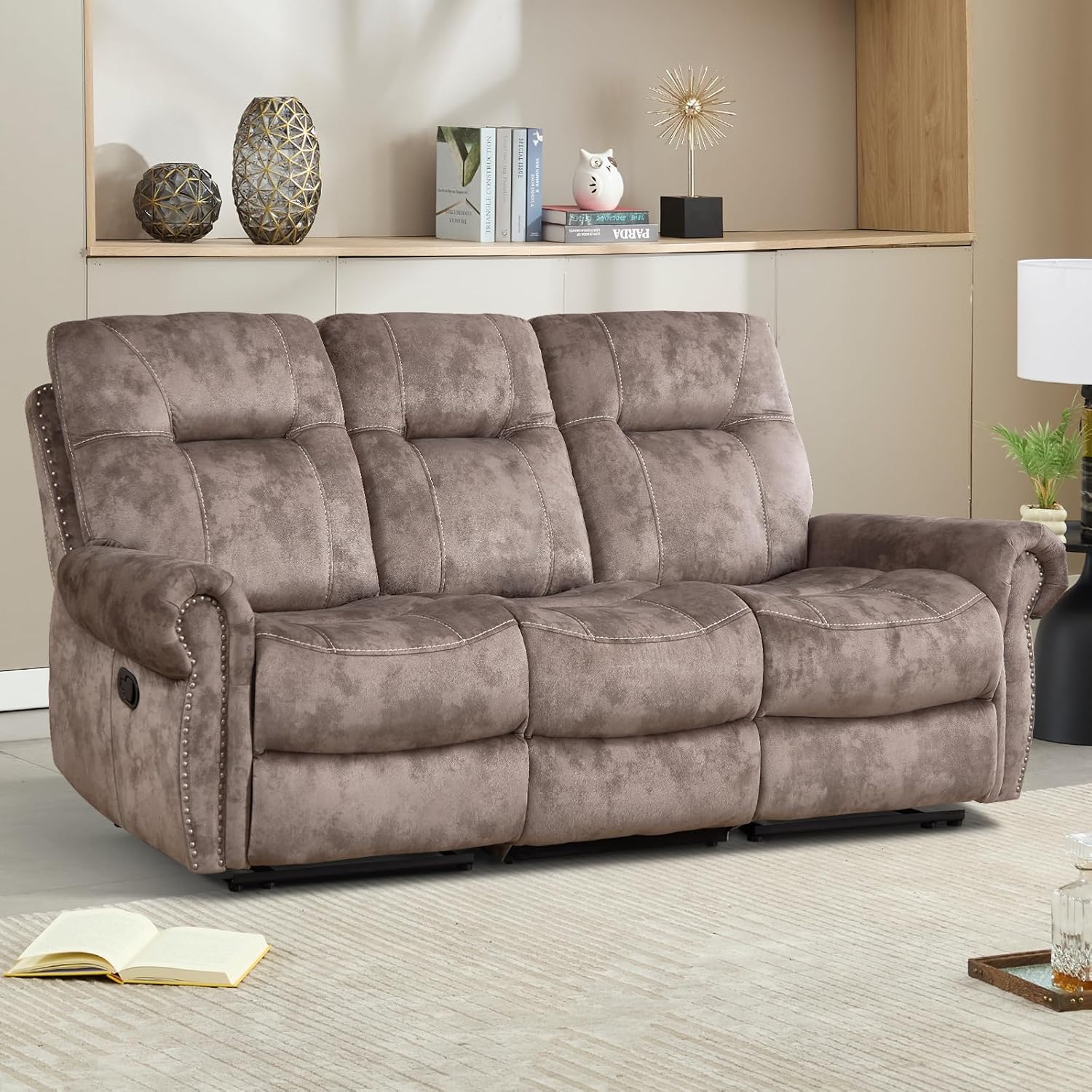 EBELLO Manual Recliner 3 Seat Sofa Couch, Soft Fabric 3 Seater Reclining Couch Chair, Vintage Rivet Mid-Century Design Furniture for Living Room, Meeting Room, Brown