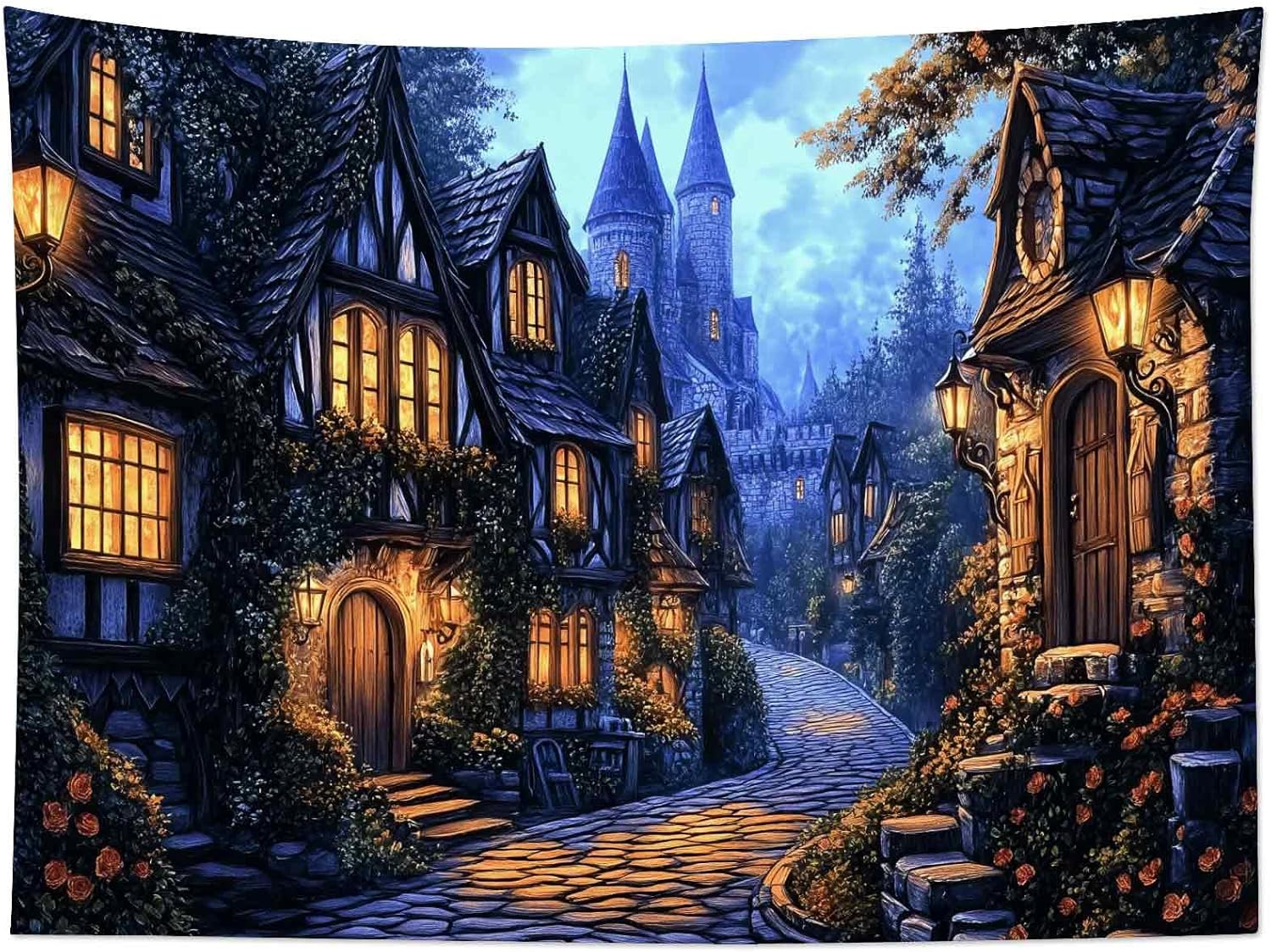 LB Vintage Castle Tapestry, Night Street Old House and Green Tree Wall Tapestry for Bedroom Aesthetic, Village Gothic Wall Art for Living Room Dorm Home Decor Ready to Hanging, 60 x 40 Inches