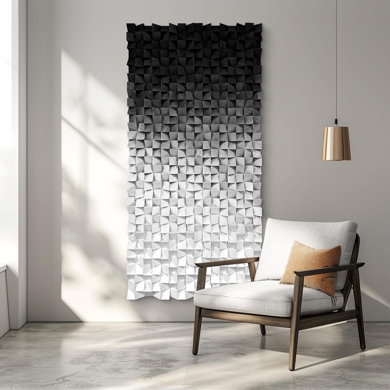 - 【Stunning visual effect】- This decorative wall panel is 31.5 inches long and 63 inches high, pieced together with unique triangular pine blocks, presenting a highly artistic three-dimensional texture. In terms of color, it gradually transitions from white to gray, and then to deep gray black, like a naturally drawn oil painting, adding unique visual charm and artistic atmosphere to the space.