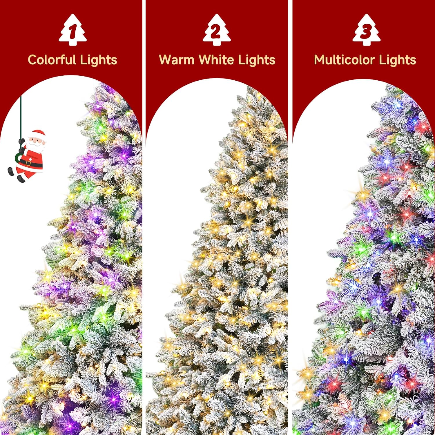 9ft Pre-Lit Snow Flocked Rotating Christmas Tree with 600 Multi-Color LED Lights, 2512 PE & PVC Tips - Realistic Artificial Tree for Holiday Decor
