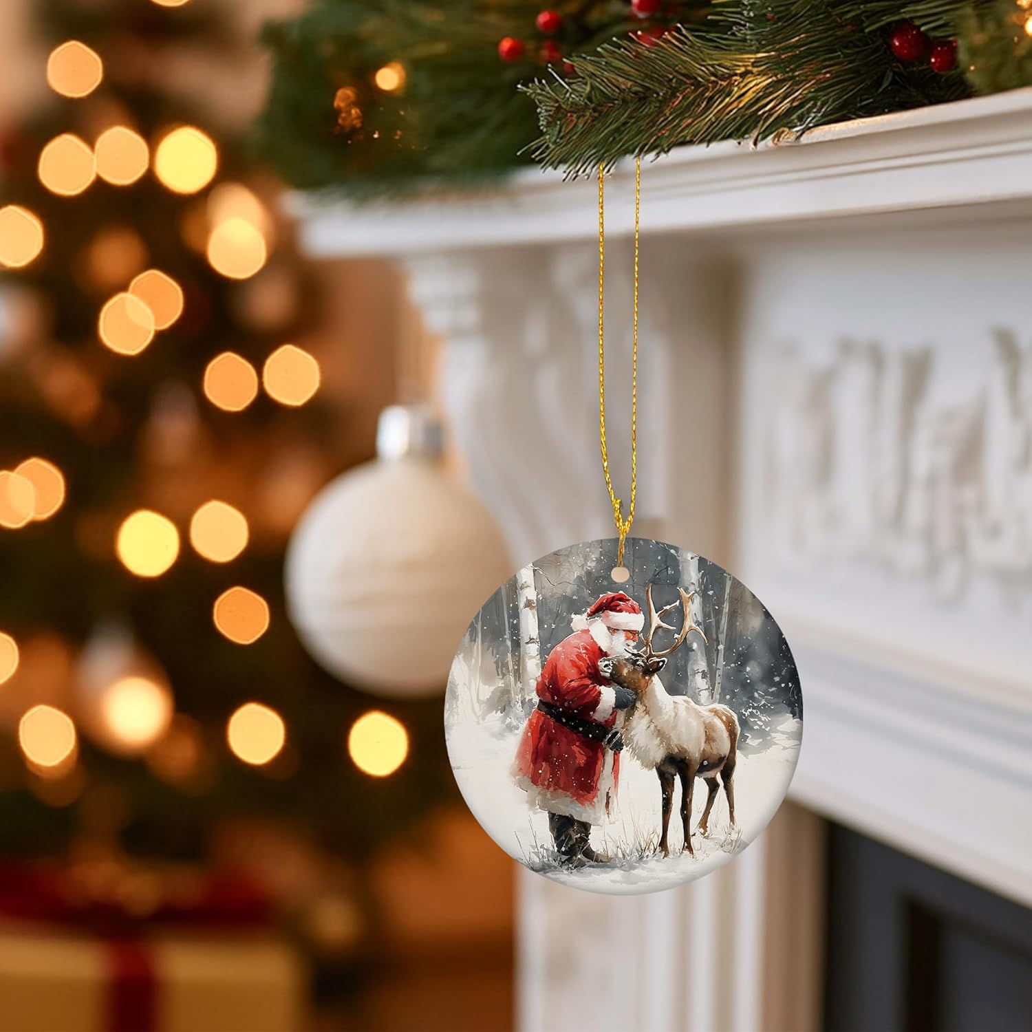 Christmas Santa Reindeer Ceramic Ornament Gifts, Rustic Winter Santa Claus Reindeer Decorative Hanging Ornaments for Xmas Tree Holiday Party Decoration, Winter Xmas Tree Decorations