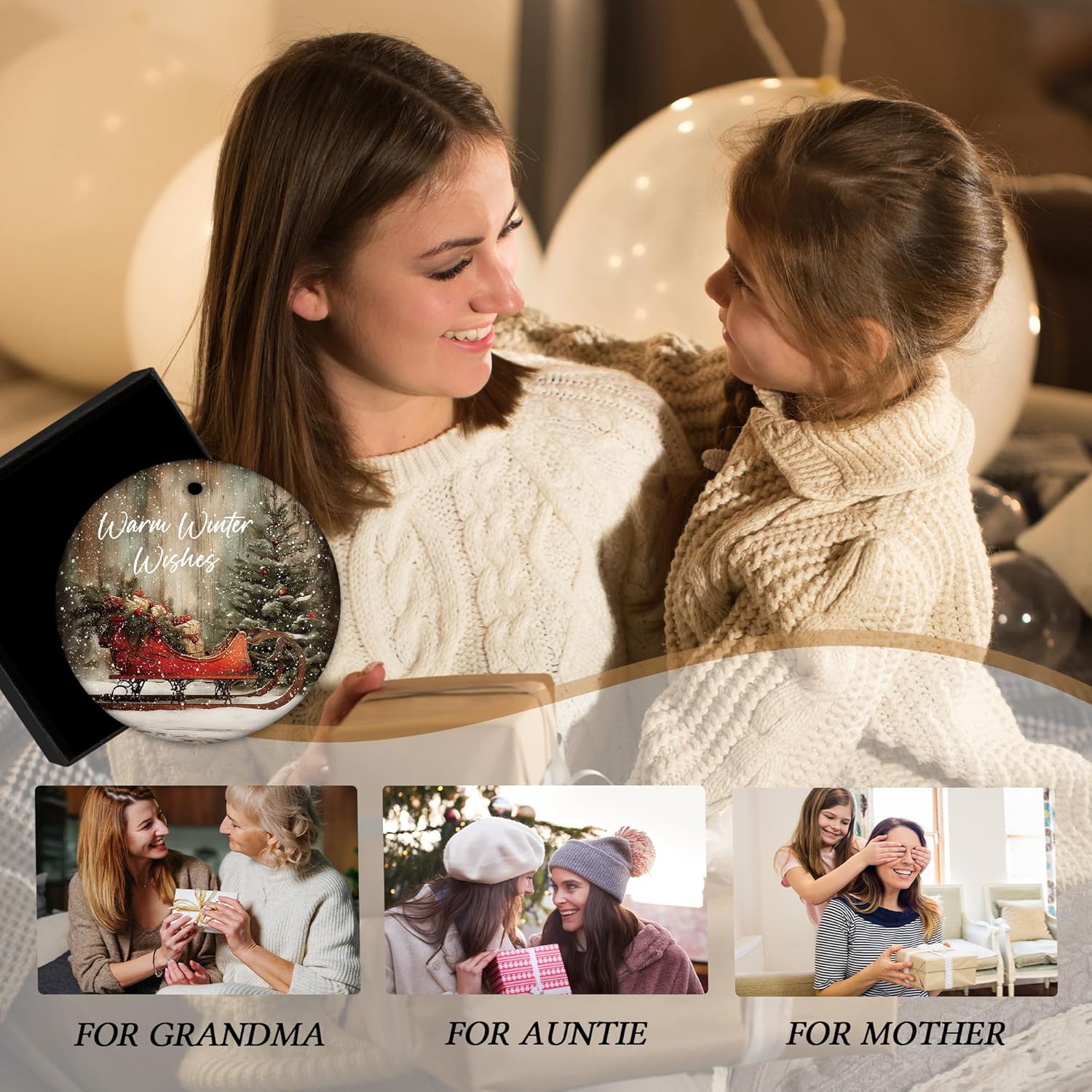 Vintage Rustic Christmas Ceramic Ornament Gifts, Farmhouse Winter Snowy Christmas Sleigh Decorative Hanging Ornaments for Xmas Tree Holiday Party Decoration, Winter Xmas Tree Decorations
