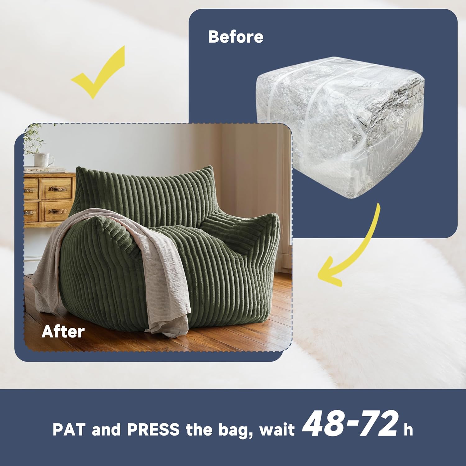 - ăComfy Bean Bag Couchă: Measuring 46.06"D x 38.58"W x 29.53"H, this versatile furniture serves as both a spacious bean bag chair for adults and a kids bean bag chair. The bean bag sofa requires no assemblyâsimply allow it to air out for 48-96 hours after unboxing. Firmly pat and fluff to accelerate expansion and restore its full cozy shape.