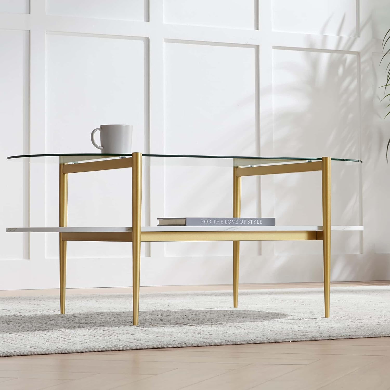 Oval Coffee Table, Mid-Century Modern Design, L41 x W21 x H17 inch, for Living Room, Clear Glass Top, White Marble Finish Wood Shelf & Gold Finish Frame