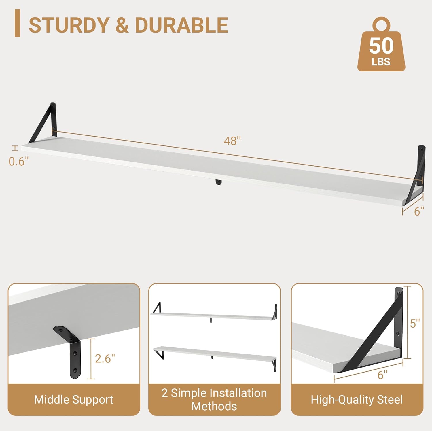 - ăSTURDY & DURABLEăEach wood floating shelves is made of 0.6-inch thick natural wood planks and powder coated steel brackets for durability. The triangular metal brackets are even stronger and can hold up to 40 pounds