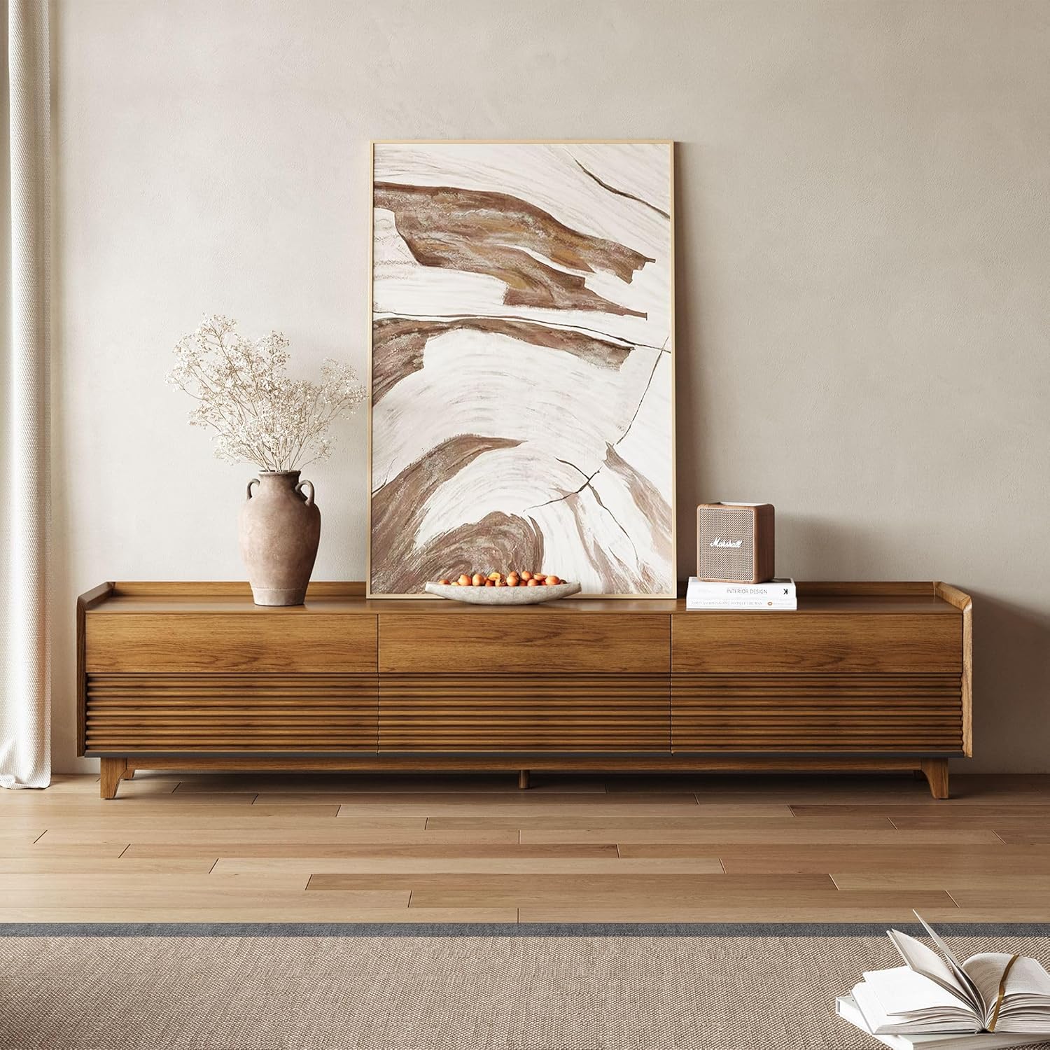 - Premium Natural Wood Grain: Our modern wood tv stand made of white wax wood grain veneer, smooth finishes and sturdy construction, not easy to deforme or cracke after a lont-term use