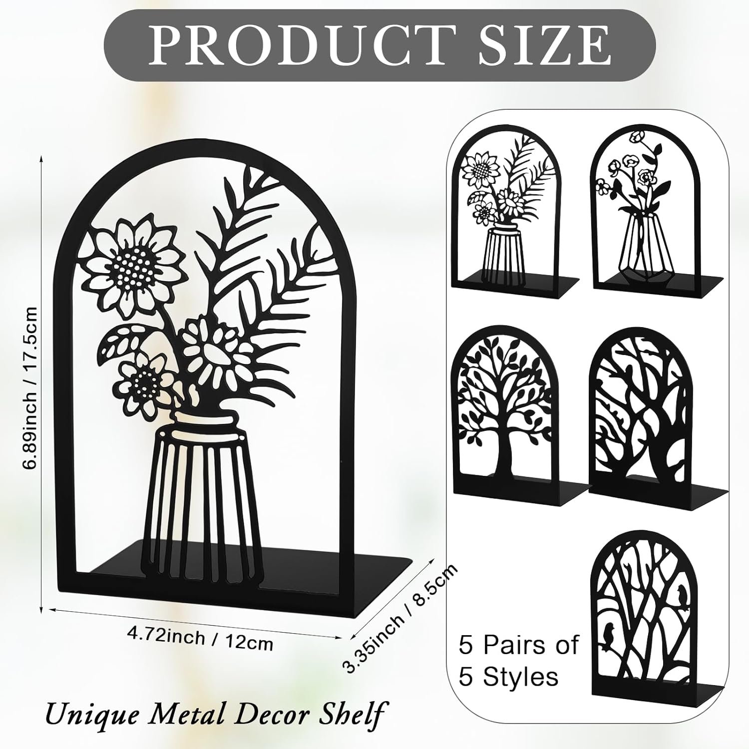 Faccito 5 Pairs Book Ends, Black Metal Bookends for Shelves Decorative, Non Skid Tree Stopper and Flower Shelf Holder for Heavy Books, Home Office School Supplies(Modern)