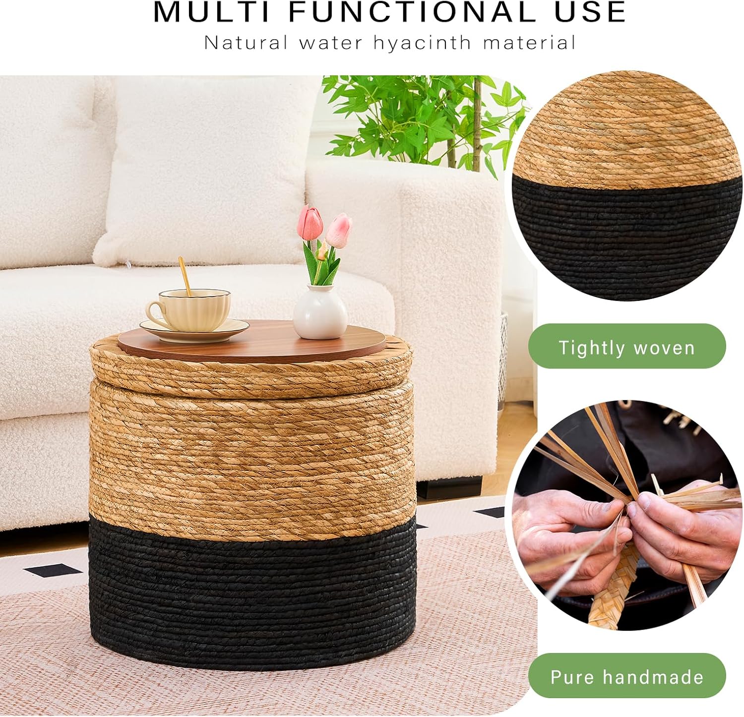 Wimarsbon 18'' Ottoman Pouf, Natural Braided Poof, Rustic Handweave Lounge Pouffe, Boho Footrest Stool for Bedroom, Accent Table for Living Room (Storage - 18inch Cattail+Black Corn Husk L)