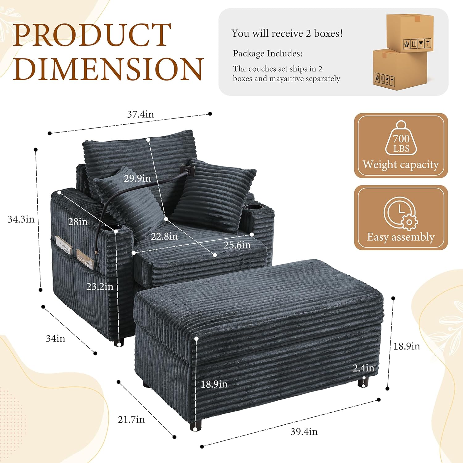 - Smart Storage Solutions — Hidden Compartments in Armrests: Keep your space clutter-free with discreet storage compartments under the armrests. Perfect for stashing remotes, books, or blankets, this feature enhances your chairs living room area by combining style with smart practicality.