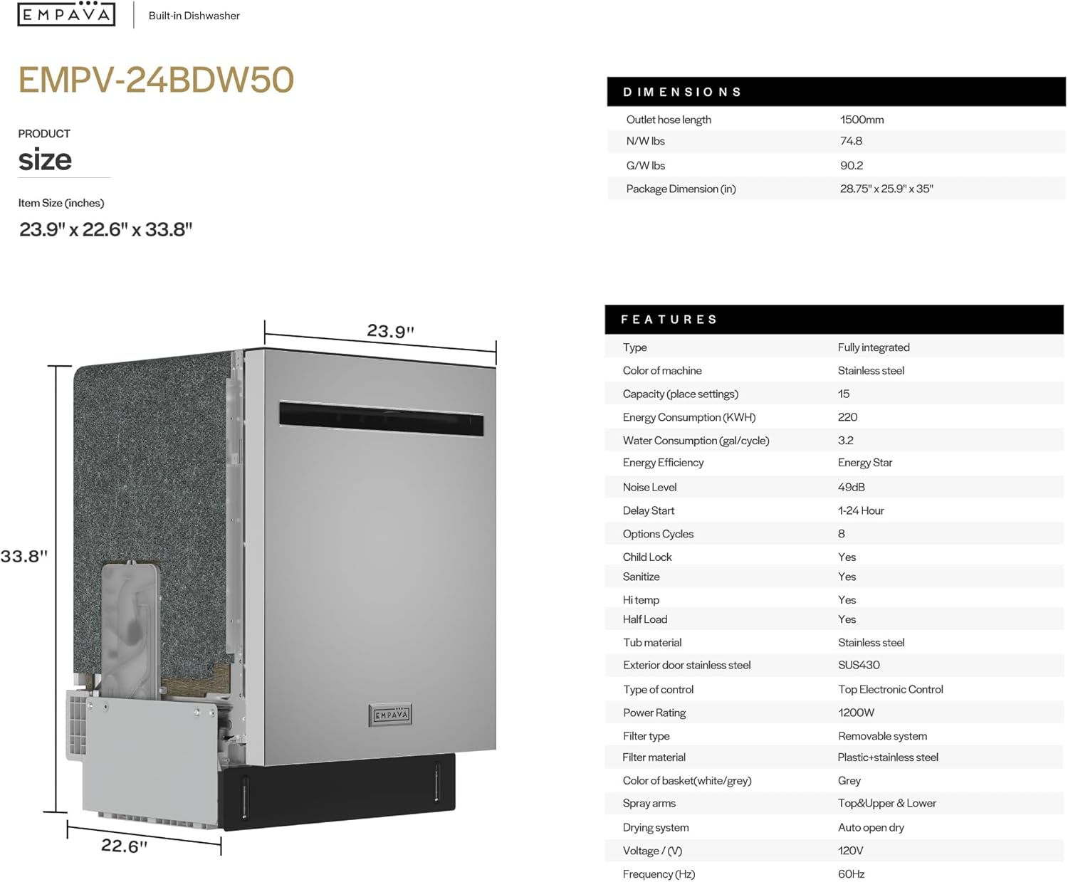 Empava 24 Inch Built-in Dishwasher, Stainless Steel Tub 15 Place Settings, 8 Wash Cycles, Top Control, Auto Door Dry, 49 dB Ultra Quiet, Energy Star & UL Certified