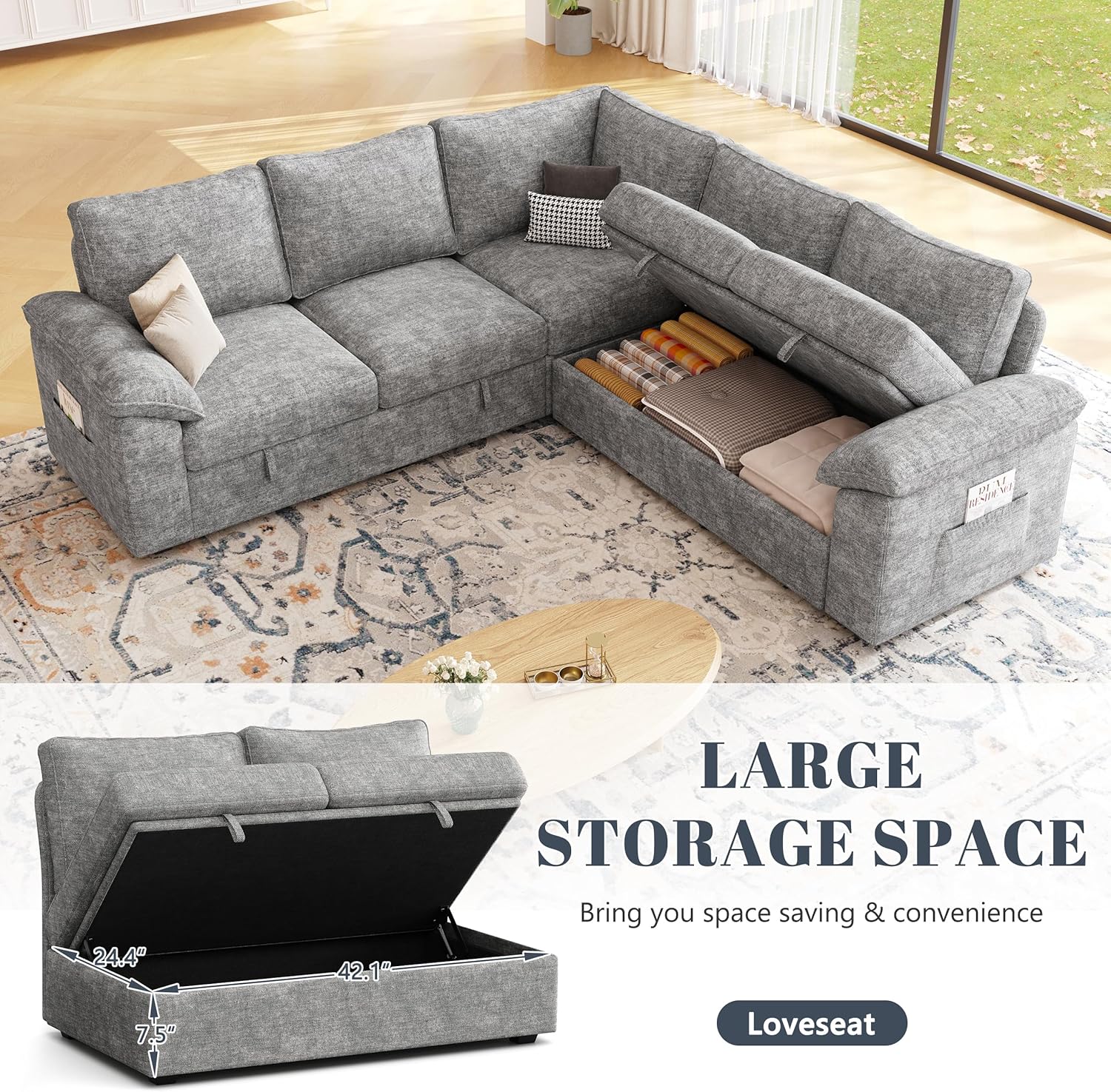 85 Inch Modular Sectional Sofa with Pull Out Bed,L Shaped 5 Seat Sectional Sleeper Sofa with Storage,Sectional Couches for Living Room,Cloud Modular Couch,Removable Sofa Cover,Light Gray
