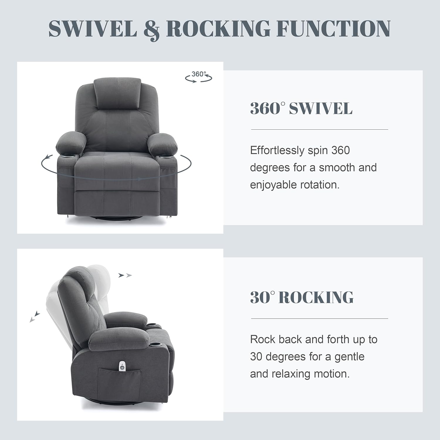 Oversized Swivel Rocker Recliner Chair with Heat and Massage, 360 Degree Swivel Rocking Single Sofa with Cup Holders and USB Port, Big Large Recliner Chair for Living Room (Fabric, Darkgrey)
