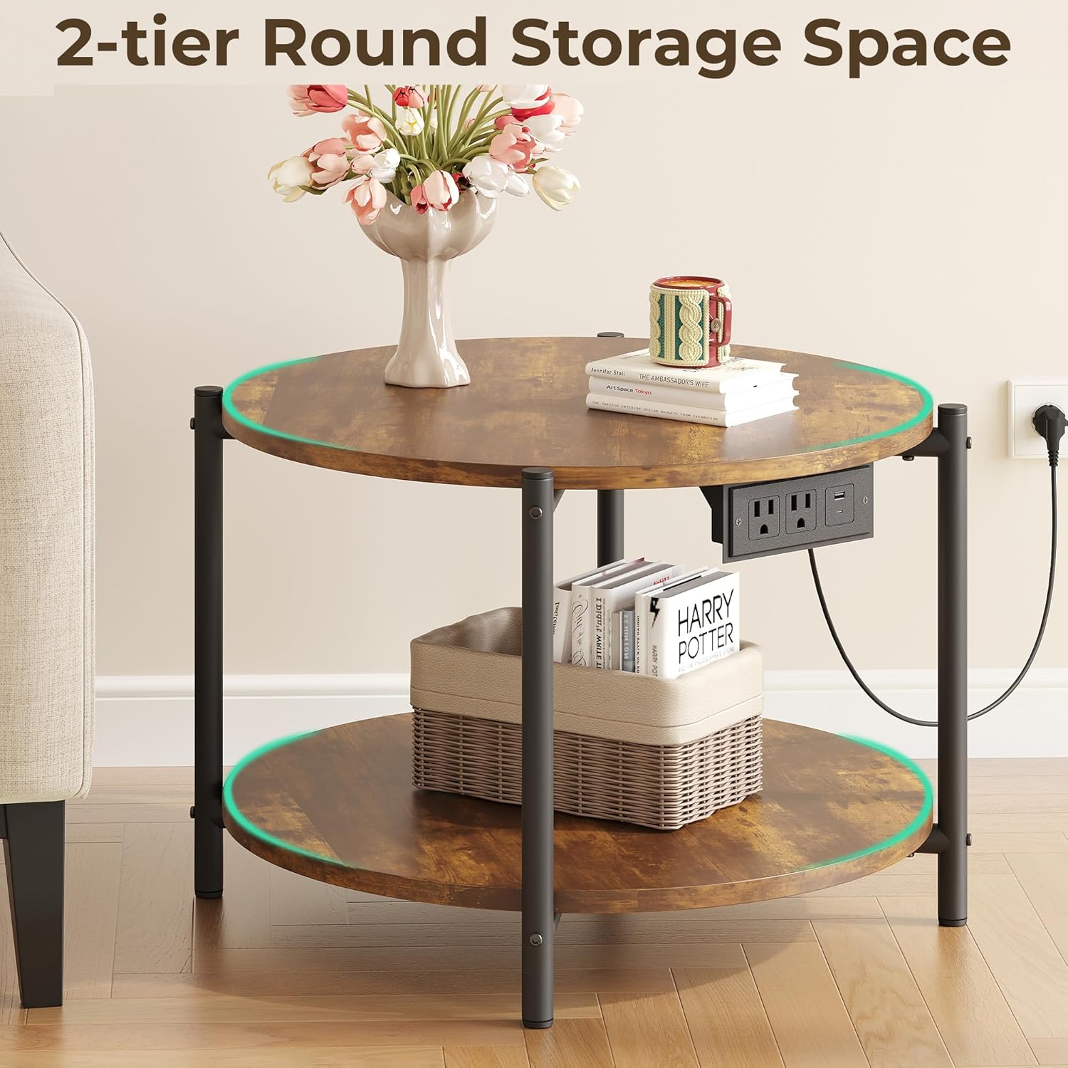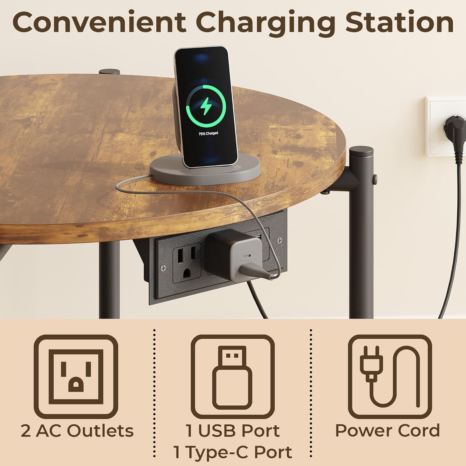 - 【Round Table with Charging Station】These round side table set of 2 features 2 AC outlets, 1 USB port, and 1 Type-C port on the sides, allowing you to charge your phone, tablet, desk lamp, and other electronic devices directly on the tabletop without worrying about spilling coffee