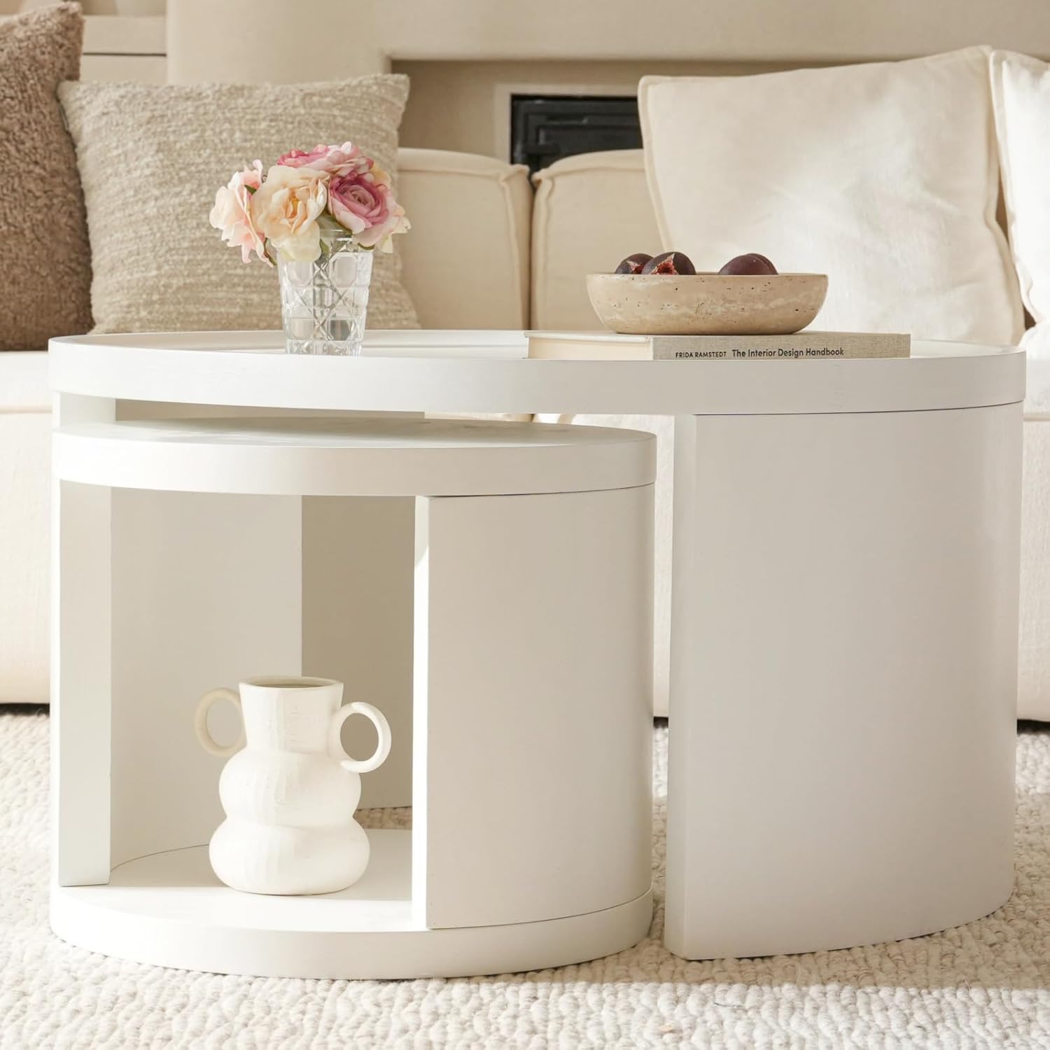 - Space-Saving Nesting Design This 2-piece round coffee table set includes a large and small table. The smaller one nests perfectly under the larger table or can be used separately as a sofa side table or nightstand.