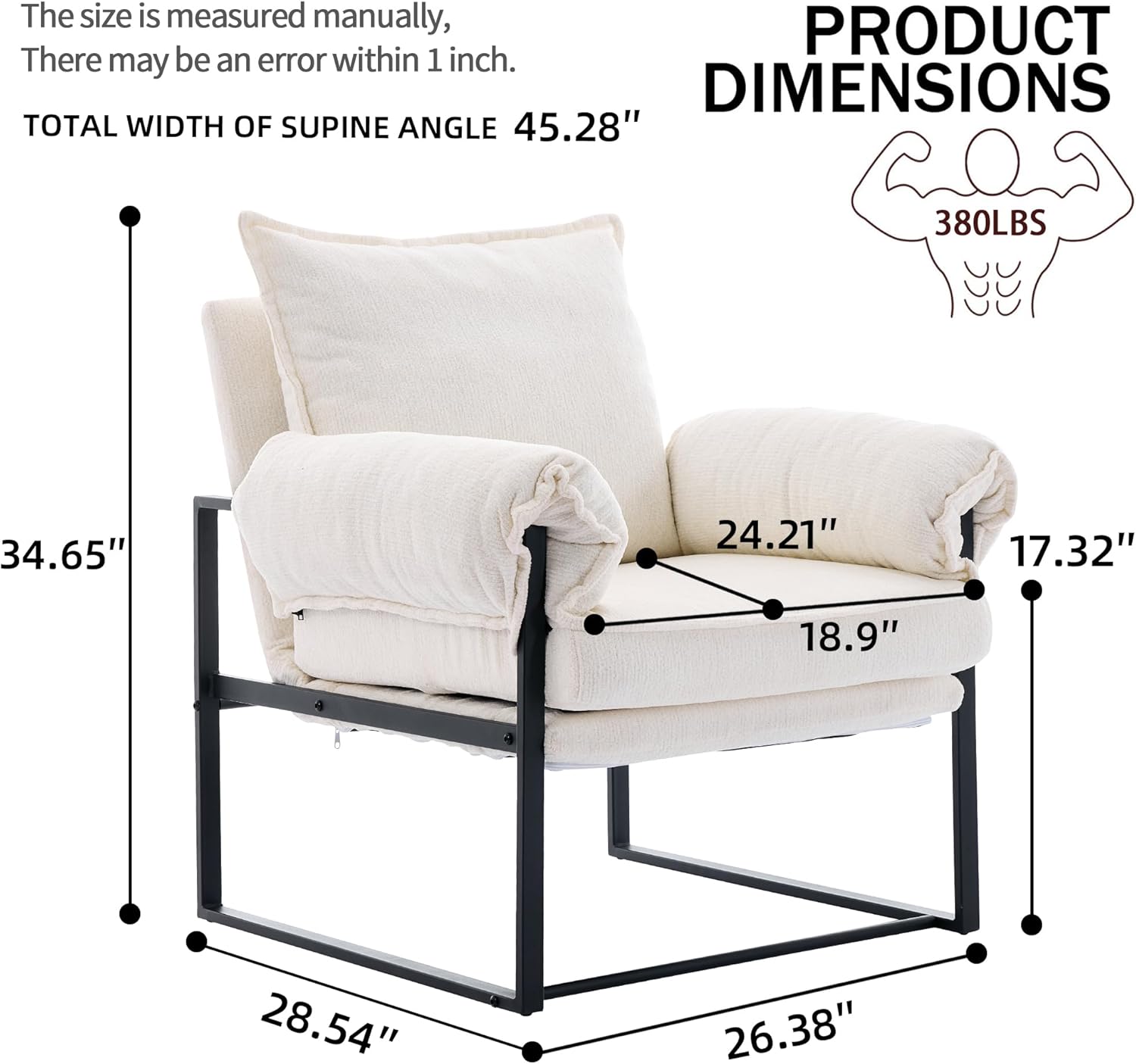 YISHENG Accent Chair with 6-Angle Adjustable Backrest, Chenille Fabric Living Room Chair Upholstered Lounge Chair, Modern Chair Cozy Reclining Chair for Reading Room, 1PC White