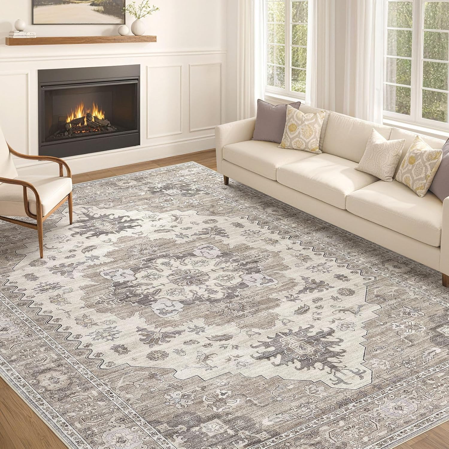 Washable Area Rugs for Living Room -10x13 Neutral Vintage Distressed Floral Farmhouse Boho Large Soft Floor Rug Indoor Non Slip Carpet for Living Room Bedroom Dining Room Office-Brown/Beige