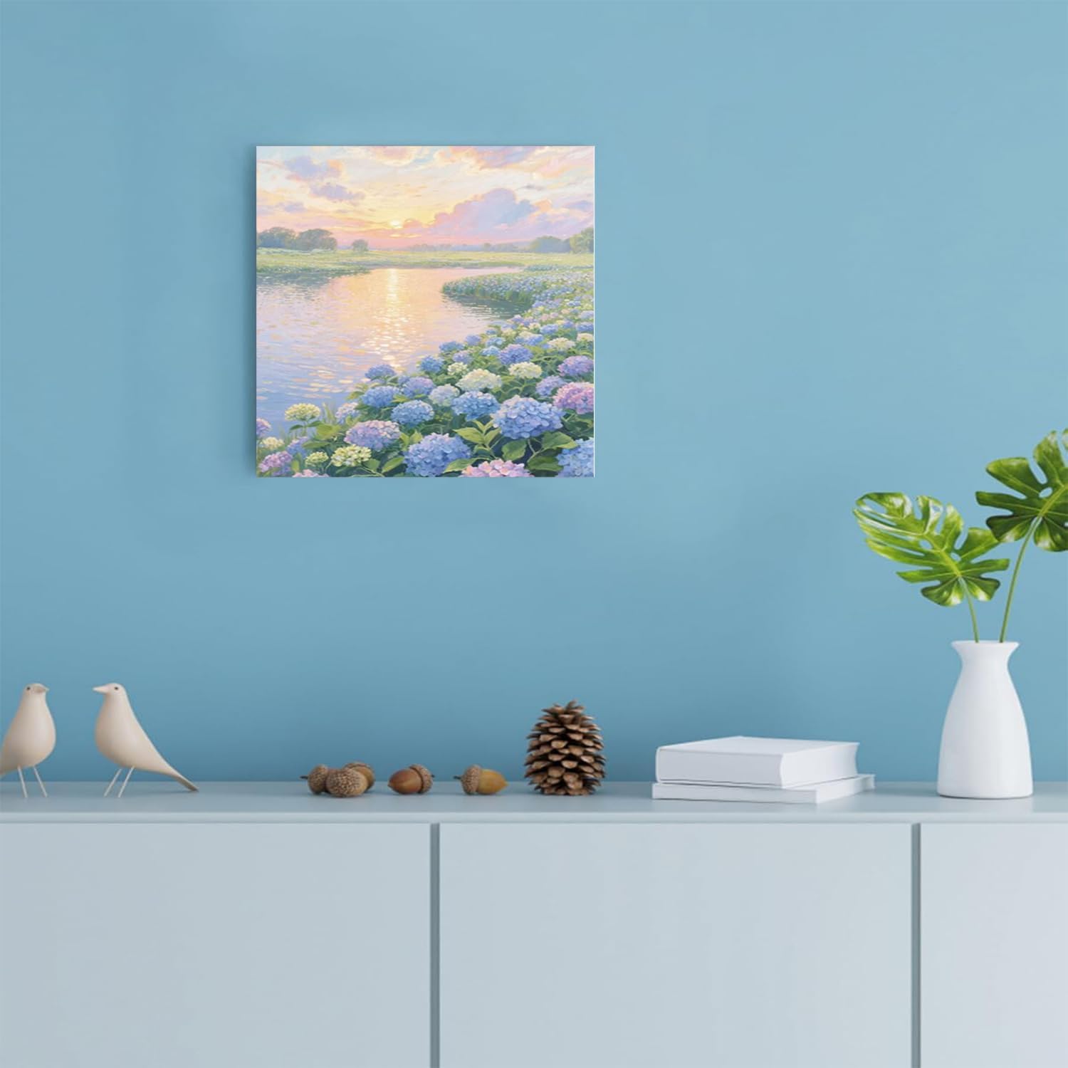 The hydrangea scenery all over the lake at sunset is suitable for posting in the living room bedroom office landscape poster wall painting