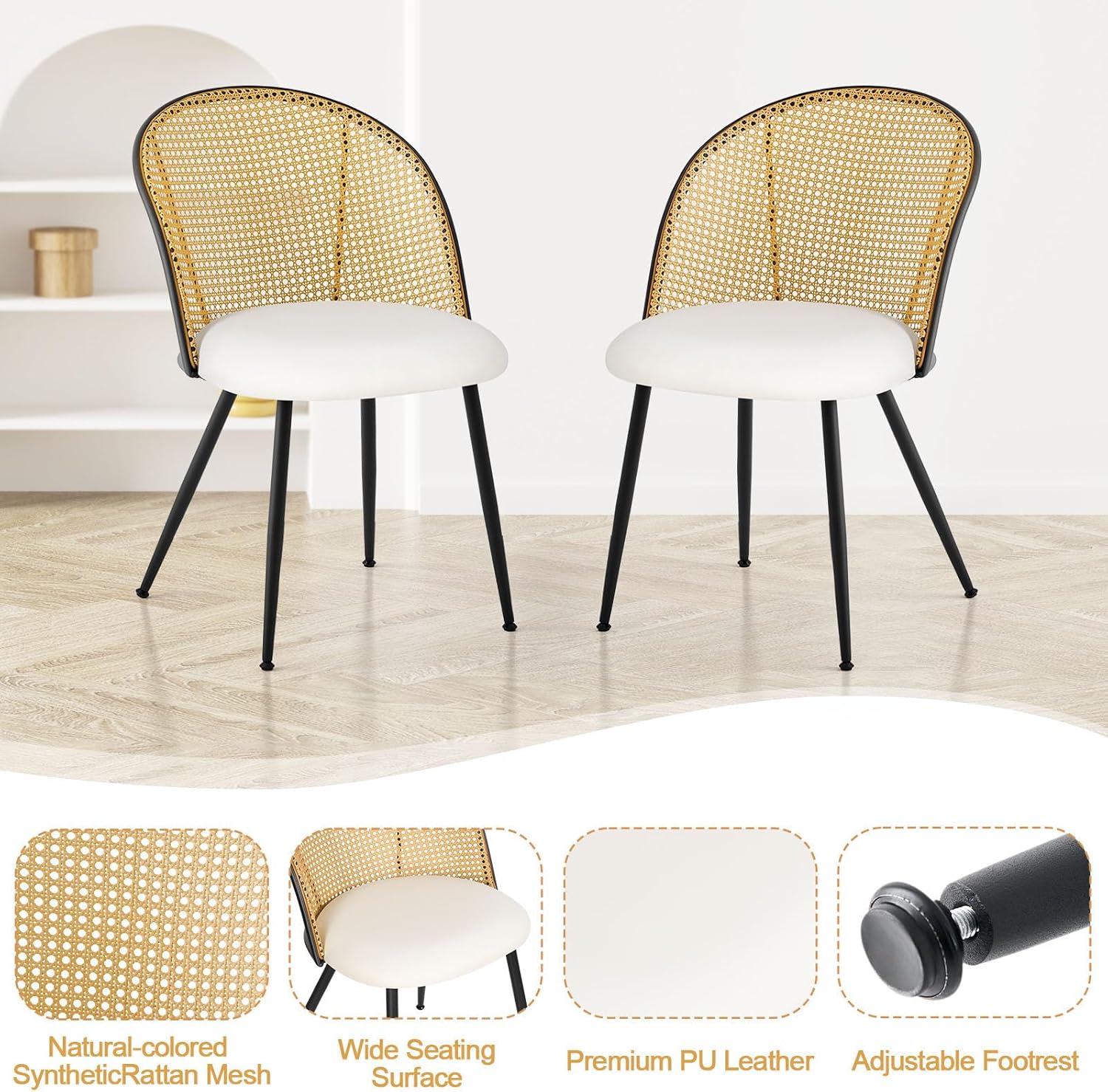 Dining Chairs Set of 6, Mid Century Modern Dining Room Chairs with Rattan Back, Faux Leather Kitchen Dining Chairs Farmhouse Armless Mesh Cane Back Side Chairs with Metal Legs, White