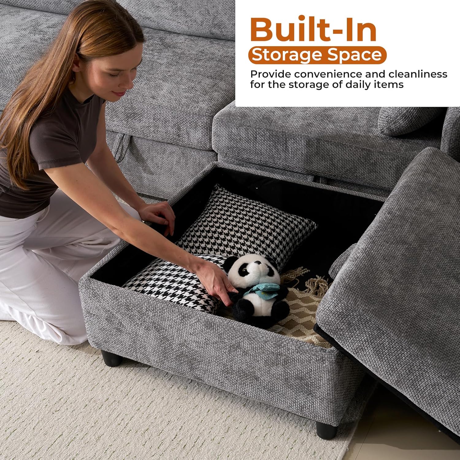 103''U Shaped Modular Sectional Sofa, Comfy Cloud Sectional Couch with Storage Ottoman, Chenille Deep Seat Modern Modular Sofa with 2 Throw Pillows for Living Room,Grey