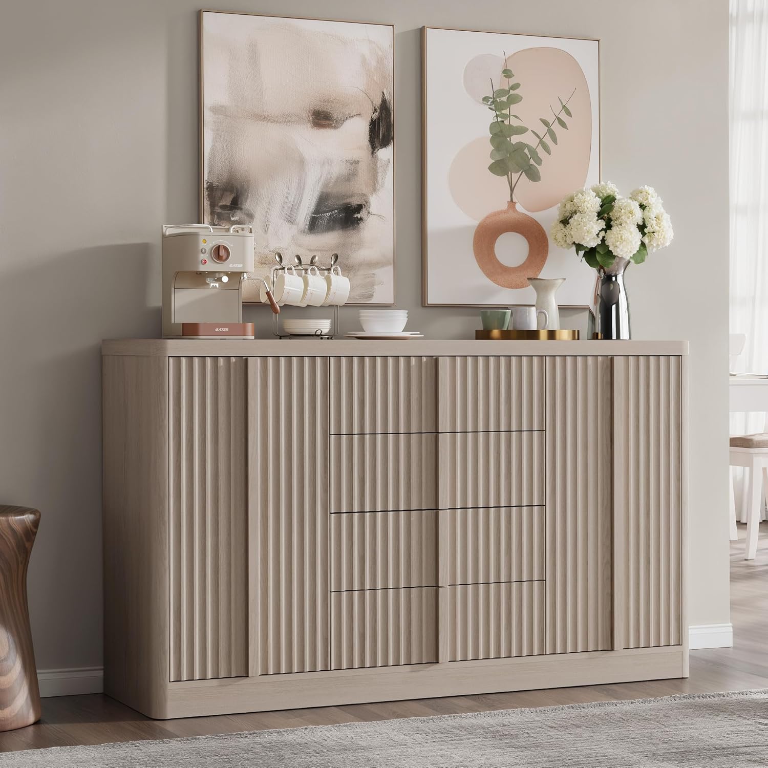 Buffet Cabinet with Storage, 60" Fluted Coffee Bar Cabinet with 4 Drawers & 2 Doors, Solid Wood Handle, Credenza Accent Storage Cabinet for Kitchen Living Dining Room, Natural Oak(1PCS)
