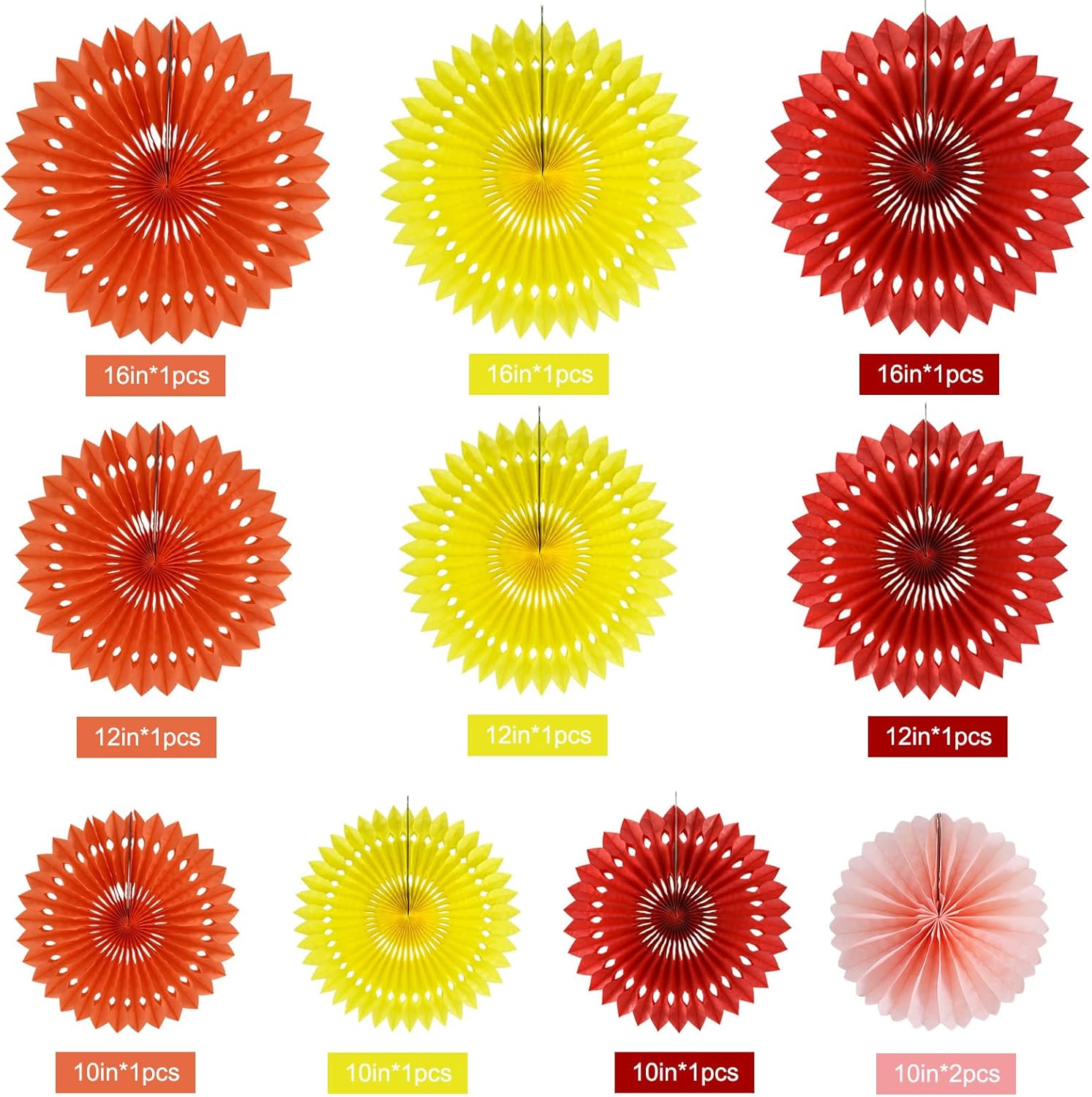 - 【Hanging decoration kit】Honeycomb paper fan set includes 11 paper fans of different sizes, among which the paper flower fan size is 16 inches * 3, 12 inches * 3, 8 inches * 3, 6 inches*2,color include red,orange,yellow.