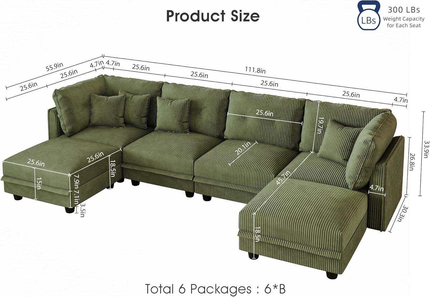 LLappuil Modular U-Shaped Sectional Sofa with Storage, 6-Seat Convertible Corduroy Couch with 6 Back Cushions & 6 Throw Pillows, Large L-Shaped Sofa for Living Room, Green