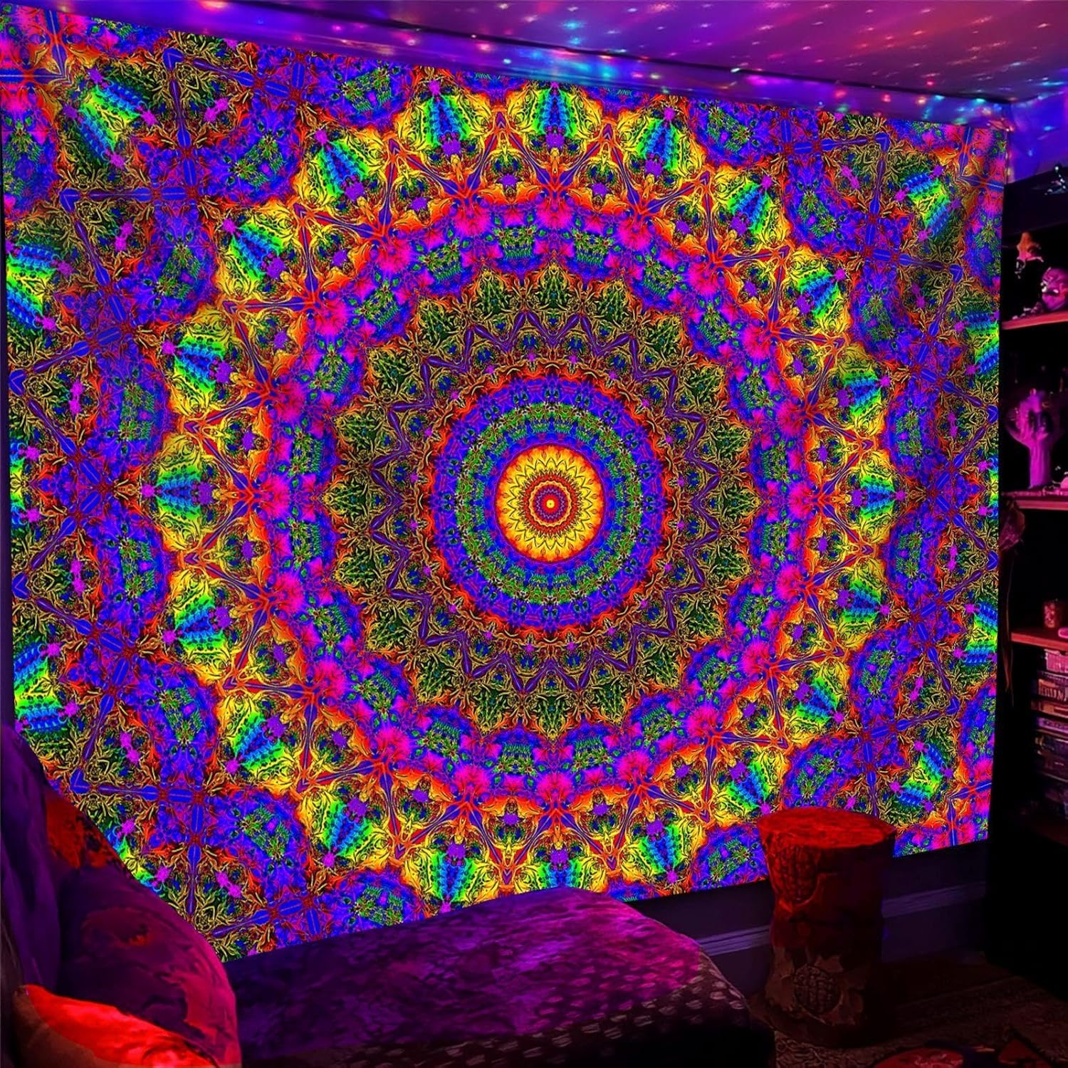 PSYHILAR Blacklight Mandala Boho Tapestry, Black Light Bohemian Hippie Poster for Adults and Teens, Aesthetic Colorful UV Reactive Wall Art Decor for Bedroom (60 x 50 Inches)