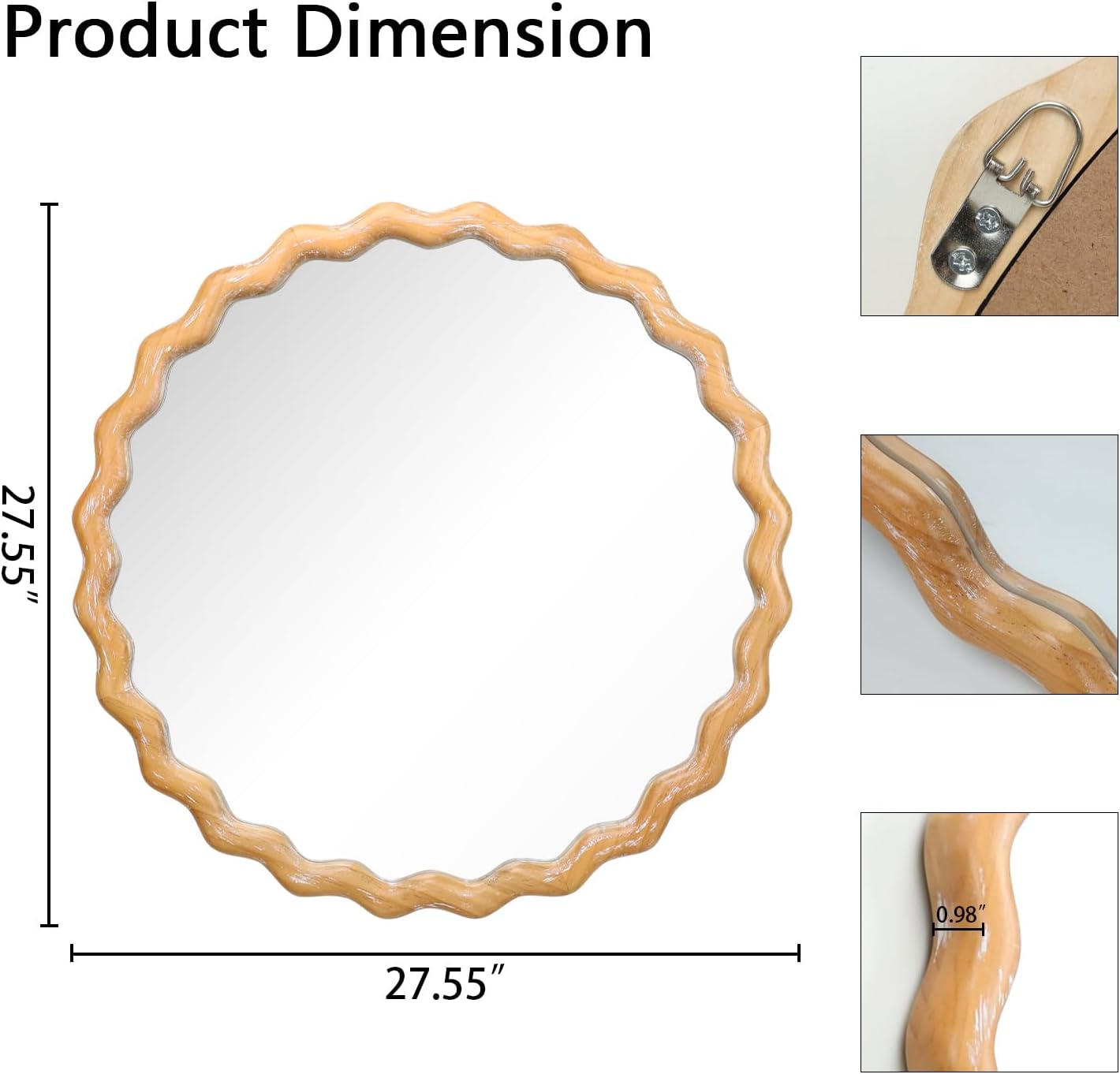 Wavy Mirror 27.5x27.5 Inch, Decorative Bathroom Mirror with Natural Wood Frame, Entry Way Mirrors for Wall, Shatterproof Glass, Mirrors for Wall Decor